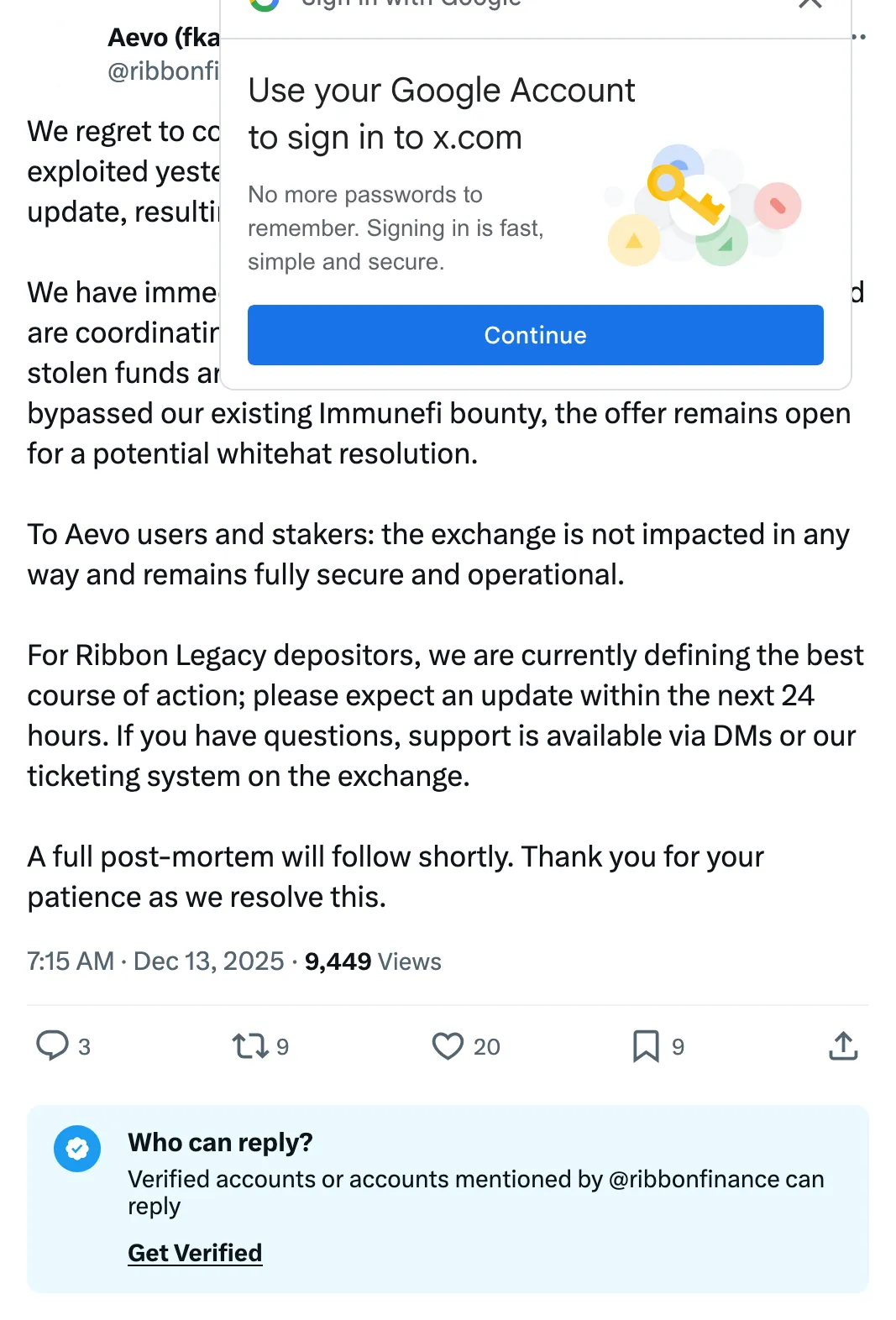 To Aevo users and stakers: the exchange is not impacted in any way and remains fully secure and operational.