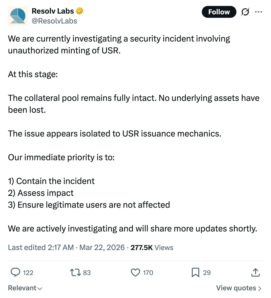 We are currently investigating a security incident involving unauthorized minting of USR.